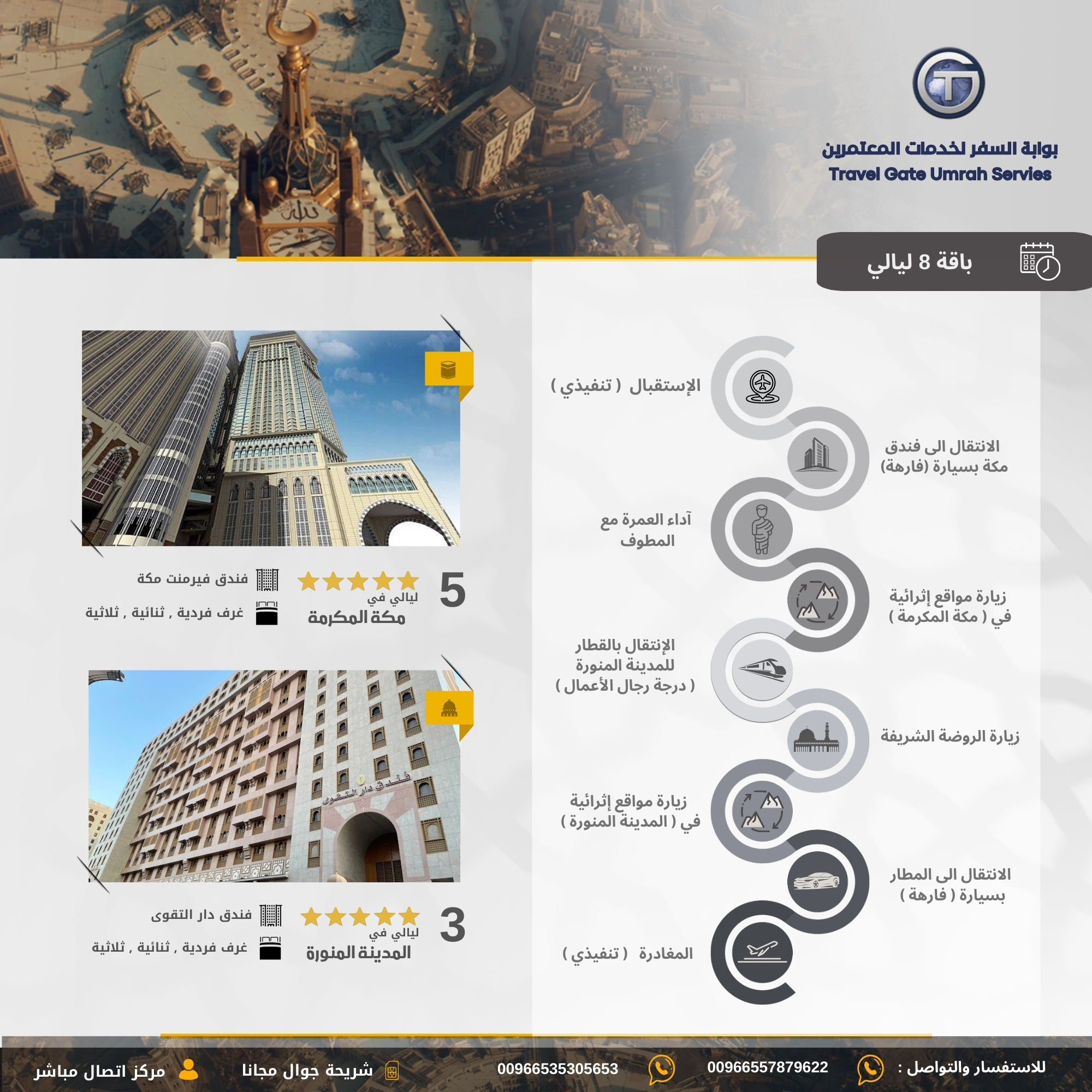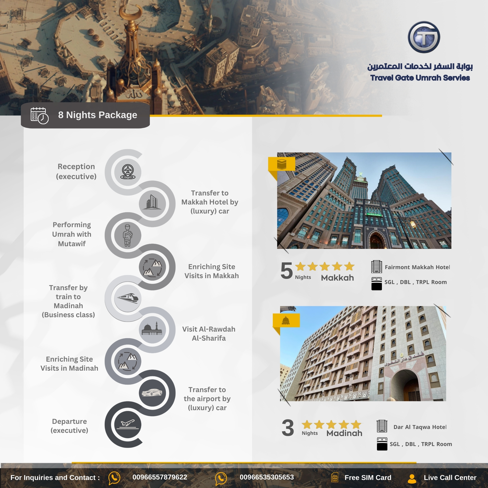 Premium Umrah Package Our goal with this package is to facilitate the Umrah journey for Muslims from around the world, providing a unique spiritual and touristic experience that remains memorable for a lifetime. We offer high-quality services that meet all your needs, including: Executive reception and farewell services at the airport, ensuring your comfort from arrival to departure. Luxury car transportation from the airport to the hotel, and from the hotel to the train station, ensuring smooth and premium transfers between Makkah and Madinah. Accommodation in five-star hotels in Makkah and Madinah, providing maximum comfort and luxury throughout your stay. Accommodation includes Breakfast and Dinner (Half Board). Visit to the Prophet's Mosque's Rawdah (Al-Rawdah Al-Sharifa) in Madinah. Business-class train transportation from Makkah to Madinah for a high-end and comfortable travel experience. Performing Umrah with a licensed guide (Mutawwif), who will provide complete religious guidance to ensure the smooth performance of all rituals. Enriching visits to significant historical and cultural sites in both Makkah and Madinah with a licensed tour guide. With this package, we ensure a comprehensive experience characterized by high-quality service at every step, from luxury transportation and comfortable accommodation to religious guidance and enriching touristic experiences.