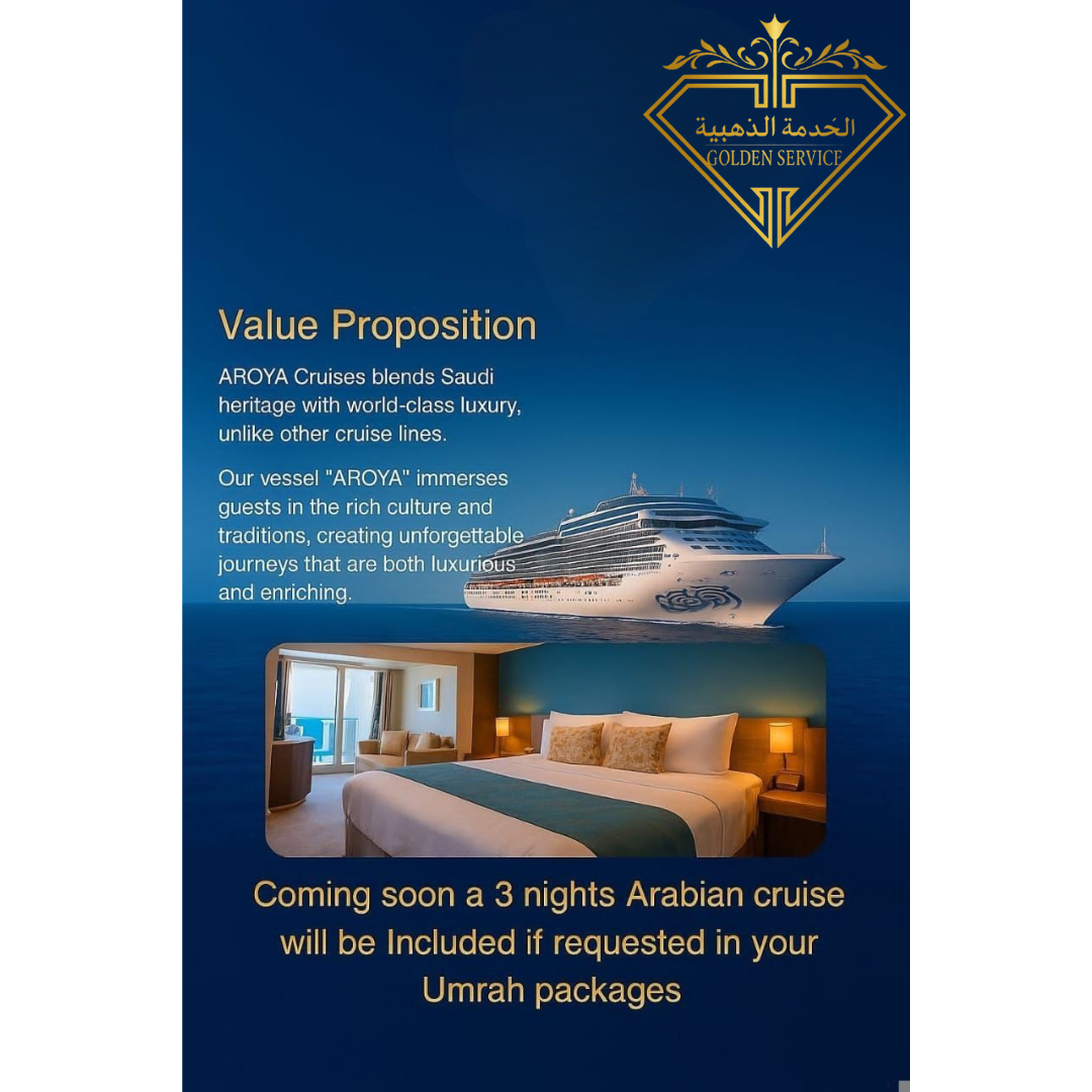 Enjoy an exceptional Umrah journey that combines comfort, luxury, and tranquility. From the moment you arrive at the airport, our dedicated team welcomes you with premium meet-and-greet services, along with luxurious, fully equipped vehicles to ensure a smooth and comfortable transfer between Makkah and Madinah, whether by high-speed train or private transportation. Your package includes upscale accommodation in five-star hotels: 7 nights at Swissotel Al Maqam in Makkah and 3 nights at Elaf Al Taqwa Hotel in Madinah, with daily breakfast at both hotels—placing you just steps away from the holy sanctuaries and worship areas. You will enjoy top-quality services and modern facilities tailored to meet all your needs. Experience a luxurious 3-day Red Sea cruise, where you will discover the most beautiful destinations in Saudi Arabia, surrounded by natural wonders and breathtaking coastlines. To enrich your journey, we provide private tours to prominent Islamic and historical landmarks, including in Makkah: Jabal Al-Noor, Ghar Hira, and Jabal Al-Thawr, and in Madinah: Quba Mosque and Uhud’s Sayyid Al-Shuhada area, offering you a unique opportunity to explore the essence of history and reflect on profound spiritual values. Throughout your trip, we ensure continuous personalized service, attending to every detail to make your experience truly unforgettable—where spirituality meets comfort and luxury in an exceptional atmosphere.