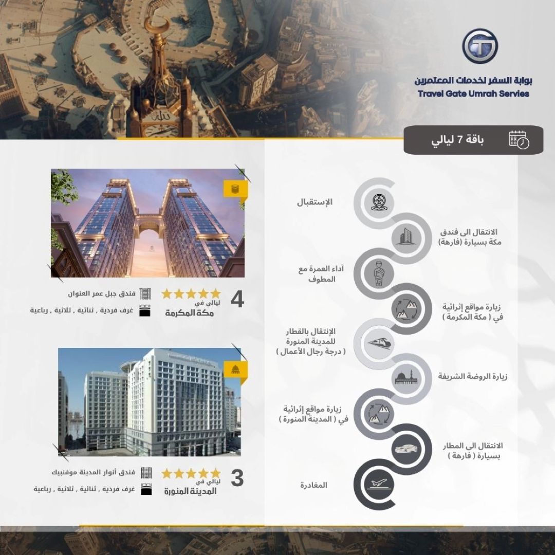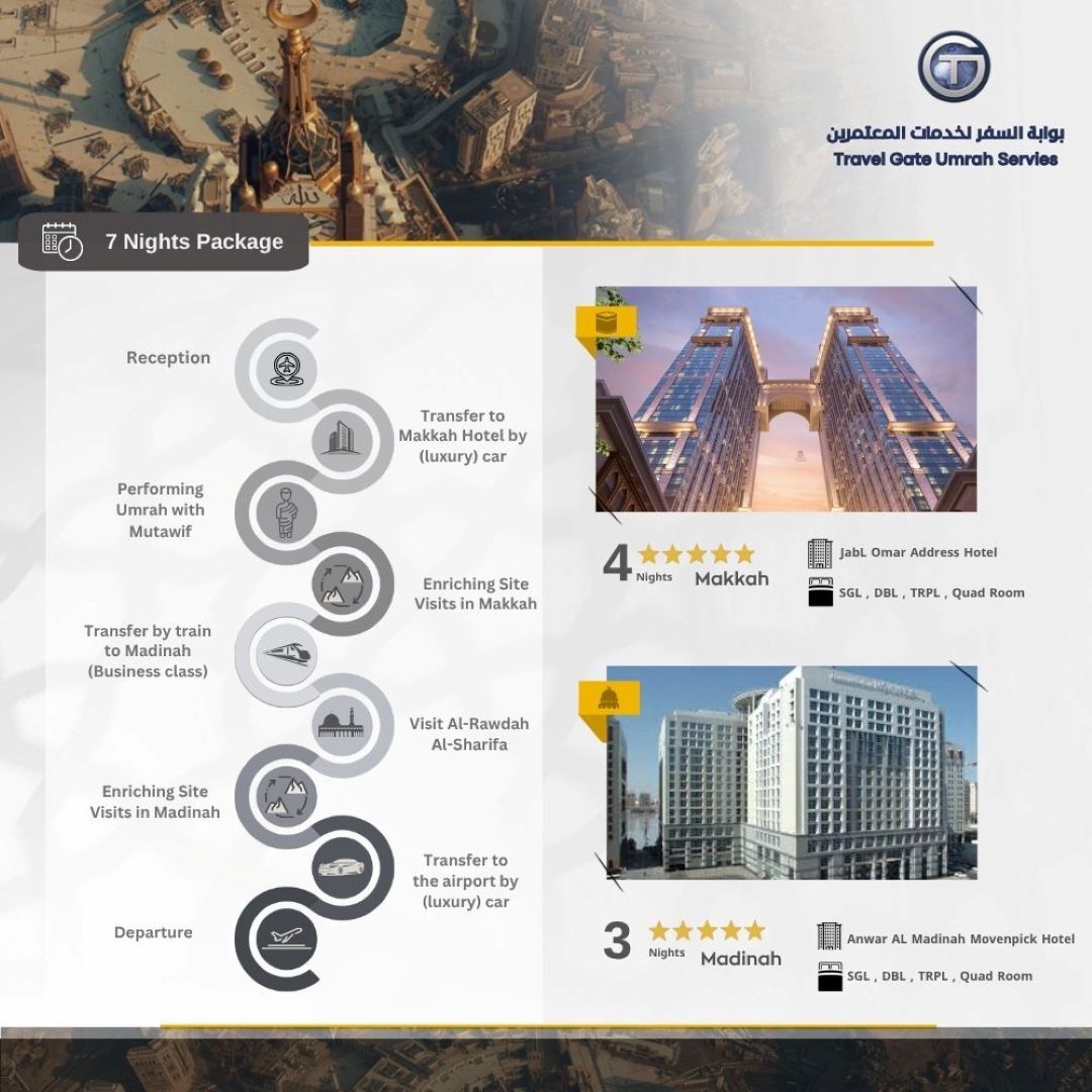 Luxury Umrah Package Our goal with this package is to facilitate the Umrah journey for Muslims from around the world, providing a unique spiritual and touristic experience that remains memorable for a lifetime. We offer high-quality services that meet all your needs, including: reception and farewell services at the airport, ensuring your comfort from arrival to departure. Luxury car transportation from the airport to the hotel, and from the hotel to the train station, ensuring smooth and premium transfers between Makkah and Madinah. Accommodation in five-star hotels in Makkah and Madinah, providing maximum comfort and luxury throughout your stay. Accommodation includes Breakfast. Visit to the Prophet's Mosque's Rawdah (Al-Rawdah Al-Sharifa) in Madinah. Business-class train transportation from Makkah to Madinah for a high-end and comfortable travel experience. Performing Umrah with a licensed guide (Mutawwif), who will provide complete religious guidance to ensure the smooth performance of all rituals. Enriching visits to significant historical and cultural sites in both Makkah and Madinah with a licensed tour guide. With this package, we ensure a comprehensive experience characterized by high-quality service at every step, from luxury transportation and comfortable accommodation to religious guidance and enriching touristic experiences.