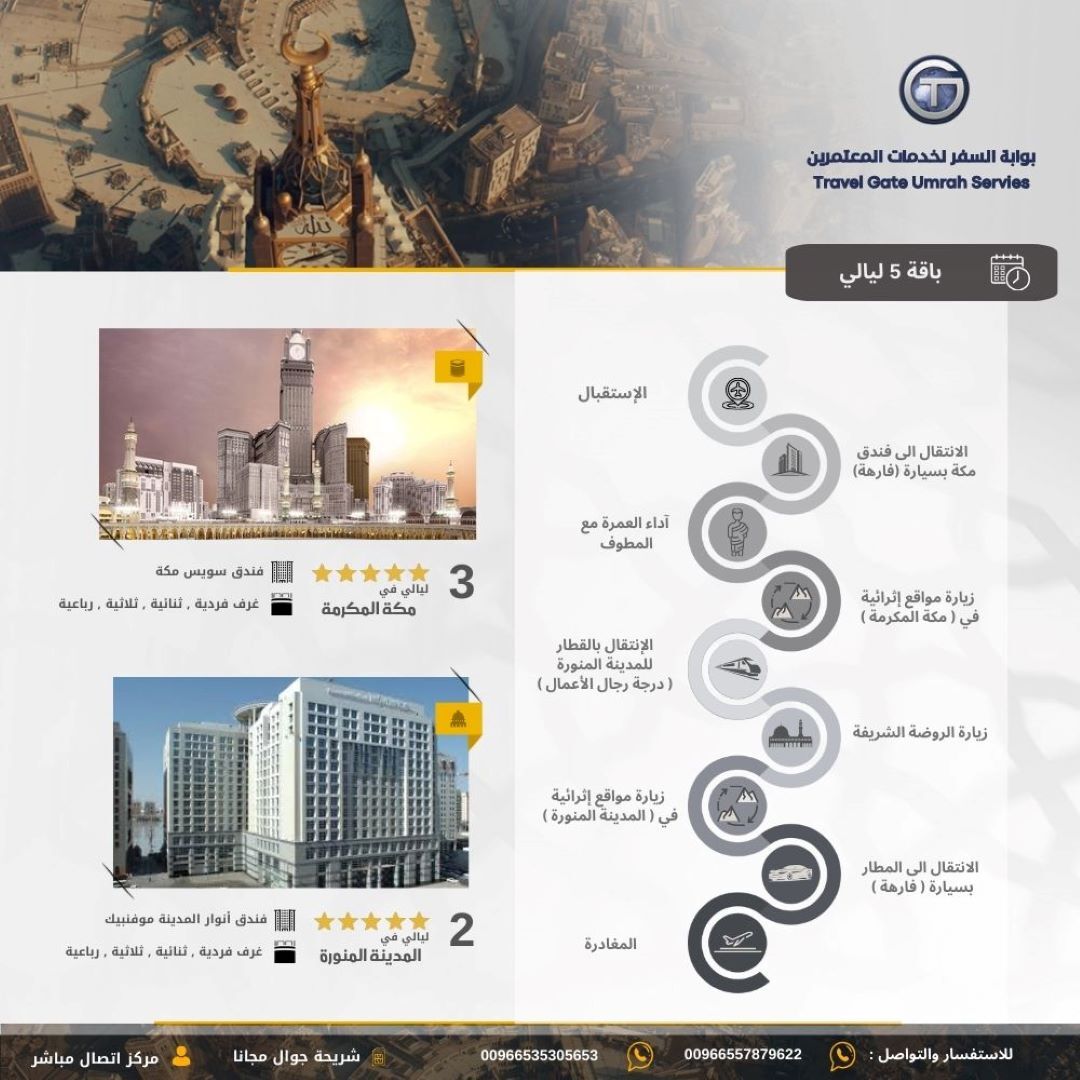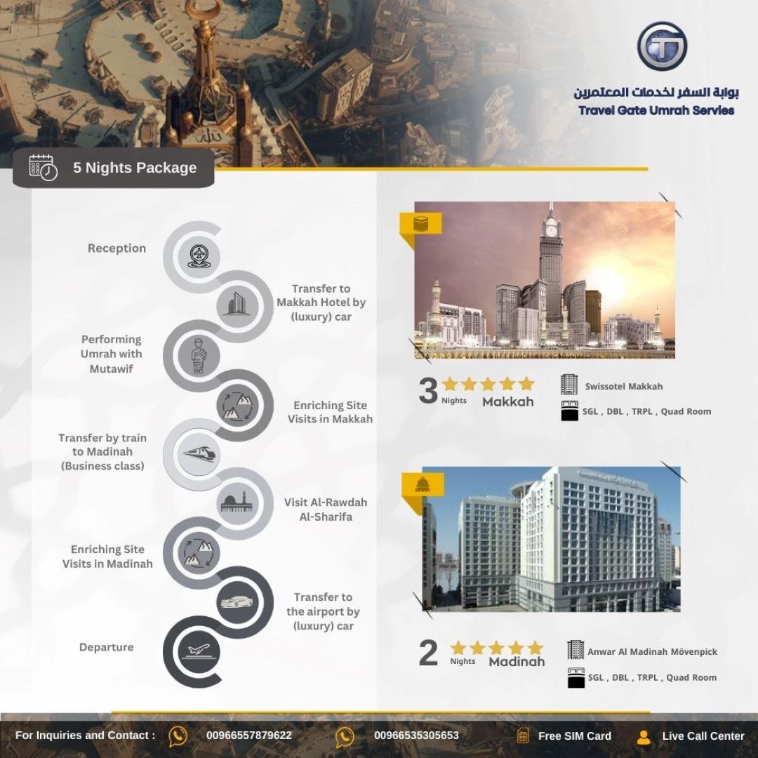 Premium Umrah Package Our goal with this package is to facilitate the Umrah journey for Muslims from around the world, providing a unique spiritual and touristic experience that remains memorable for a lifetime. We offer high-quality services that meet all your needs, including: reception and farewell services at the airport, ensuring your comfort from arrival to departure. Luxury car transportation from the airport to the hotel, and from the hotel to the train station, ensuring smooth and premium transfers between Makkah and Madinah. Accommodation in five-star hotels in Makkah and Madinah, providing maximum comfort and luxury throughout your stay. Accommodation includes Breakfast. Visit to the Prophet's Mosque's Rawdah (Al-Rawdah Al-Sharifa) in Madinah. Business-class train transportation from Makkah to Madinah for a high-end and comfortable travel experience. Performing Umrah with a licensed guide (Mutawwif), who will provide complete religious guidance to ensure the smooth performance of all rituals. Enriching visits to significant historical and cultural sites in both Makkah and Madinah with a licensed tour guide. With this package, we ensure a comprehensive experience characterized by high-quality service at every step, from luxury transportation and comfortable accommodation to religious guidance and enriching touristic experiences.