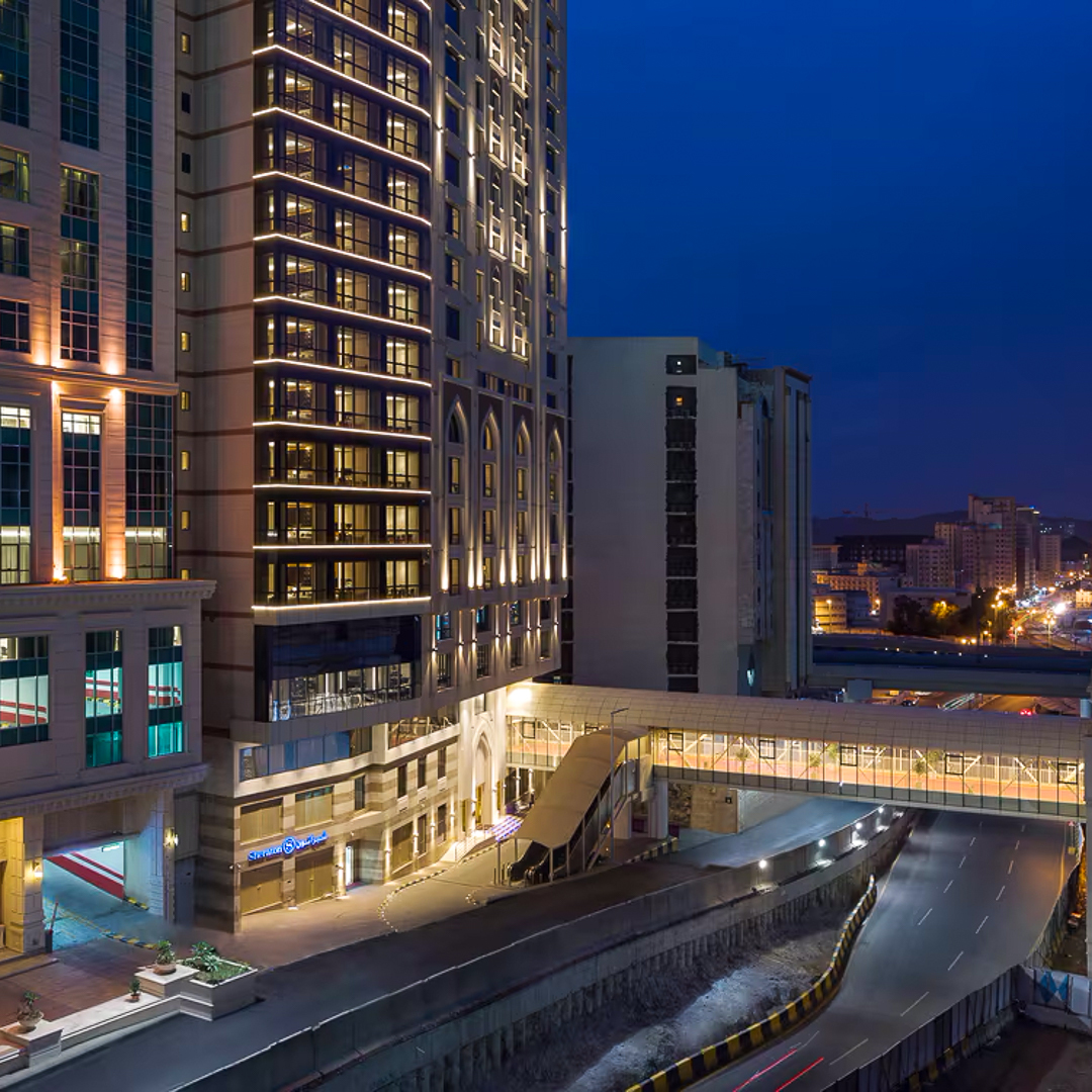 A premium package that includes 4-star hotels in Makkah and 5-star hotels in Madinah, all located near the Holy Mosques, with exceptional services provided throughout the trip. Accommodation in Makkah will be at the Sheraton Jabal Al Kaaba Hotel, one of the luxurious hotels surrounded by a variety of restaurants and services Accommodation in Madinah will be at the Maden Hotel, a five-star hotel with a prime location just 100 meters from the Prophet’s Mosque The package includes breakfast throughout the stay It also includes all transportation services, including arrival, departure, and intercity transfers