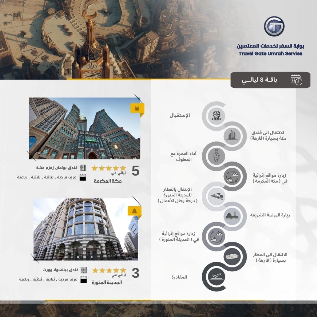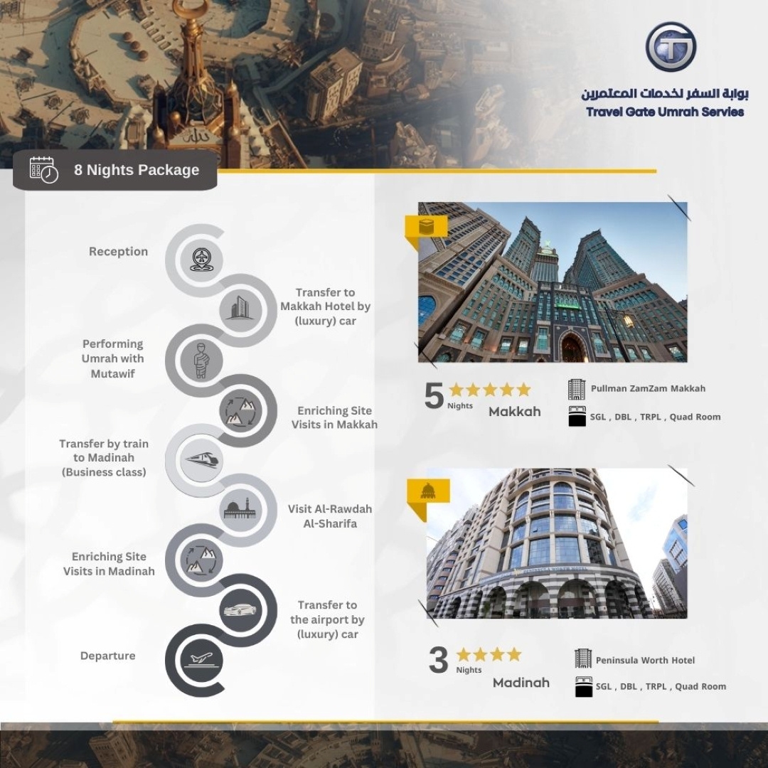 Premium Umrah Package Our goal with this package is to facilitate the Umrah journey for Muslims from around the world, providing a unique spiritual and touristic experience that remains memorable for a lifetime. We offer high-quality services that meet all your needs, including: reception and farewell services at the airport, ensuring your comfort from arrival to departure. Luxury car transportation from the airport to the hotel, and from the hotel to the train station, ensuring smooth and premium transfers between Makkah and Madinah. Accommodation in five-star hotels in Makkah and four-star hotels in Madinah, Madinah, providing maximum comfort and luxury throughout your stay. Accommodation includes Breakfast. Visit to the Prophet's Mosque's Rawdah (Al-Rawdah Al-Sharifa) in Madinah. Business-class train transportation from Makkah to Madinah for a high-end and comfortable travel experience. Performing Umrah with a licensed guide (Mutawwif), who will provide complete religious guidance to ensure the smooth performance of all rituals. Enriching visits to significant historical and cultural sites in both Makkah and Madinah with a licensed tour guide. With this package, we ensure a comprehensive experience characterized by high-quality service at every step, from luxury transportation and comfortable accommodation to religious guidance and enriching touristic experiences.