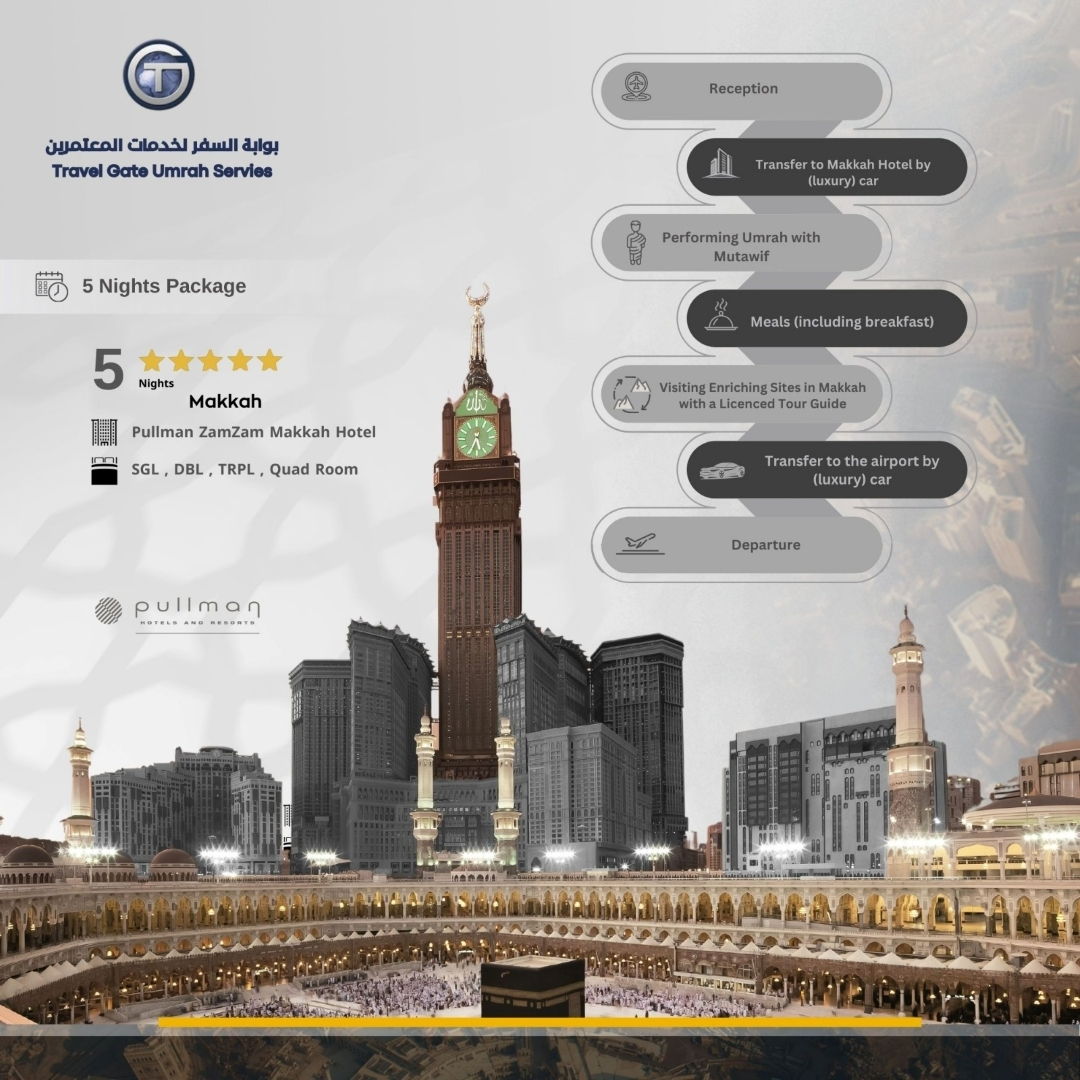 Luxure Package offer you a unique Umrah experience, carefully designed to combine spirituality and luxury, providing an atmosphere of serenity and comfort in every detail of the journey. The program features premium services that enhance your sense of exclusivity from the moment of arrival until the end of the trip. The program begins with a special welcome at the arrival airport by the Nusuk Marhaba team, followed by the provision of a luxury vehicle with a professional driver to accompany you throughout your stay. It also includes smooth and elegant transportation between Jeddah Airport and your hotel in Makkah. The package includes a 5-day stay at Pullman Zamzam Hotel (5-star) in Makkah Al-Mukarramah, with daily international breakfast, in addition to comprehensive hotel services including internet access. The program further enriches your experience with educational and cultural tours to the most prominent Islamic landmarks, allowing you to live moments of reflection and tranquility in places that shaped the history of Islam. The journey is completed with refined hospitality touches, continuous support, and welcoming services that reflect the highest levels of care and attention.