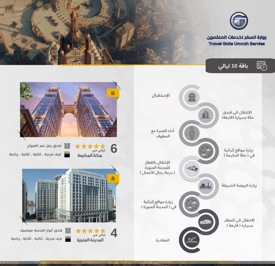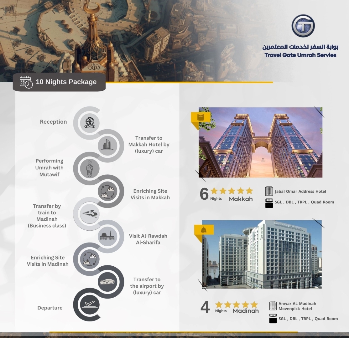 Luxury Umrah Package Our goal with this package is to facilitate the Umrah journey for Muslims from around the world, providing a unique spiritual and touristic experience that remains memorable for a lifetime. We offer high-quality services that meet all your needs, including: reception and farewell services at the airport, ensuring your comfort from arrival to departure. Luxury car transportation from the airport to the hotel, and from the hotel to the train station, ensuring smooth and premium transfers between Makkah and Madinah. Accommodation in five-star hotels in Makkah and Madinah, providing maximum comfort and luxury throughout your stay. Accommodation includes Breakfast. Visit to the Prophet's Mosque's Rawdah (Al-Rawdah Al-Sharifa) in Madinah. Business-class train transportation from Makkah to Madinah for a high-end and comfortable travel experience. Performing Umrah with a licensed guide (Mutawwif), who will provide complete religious guidance to ensure the smooth performance of all rituals. Enriching visits to significant historical and cultural sites in both Makkah and Madinah with a licensed tour guide. With this package, we ensure a comprehensive experience characterized by high-quality service at every step, from luxury transportation and comfortable accommodation to religious guidance and enriching touristic experiences.