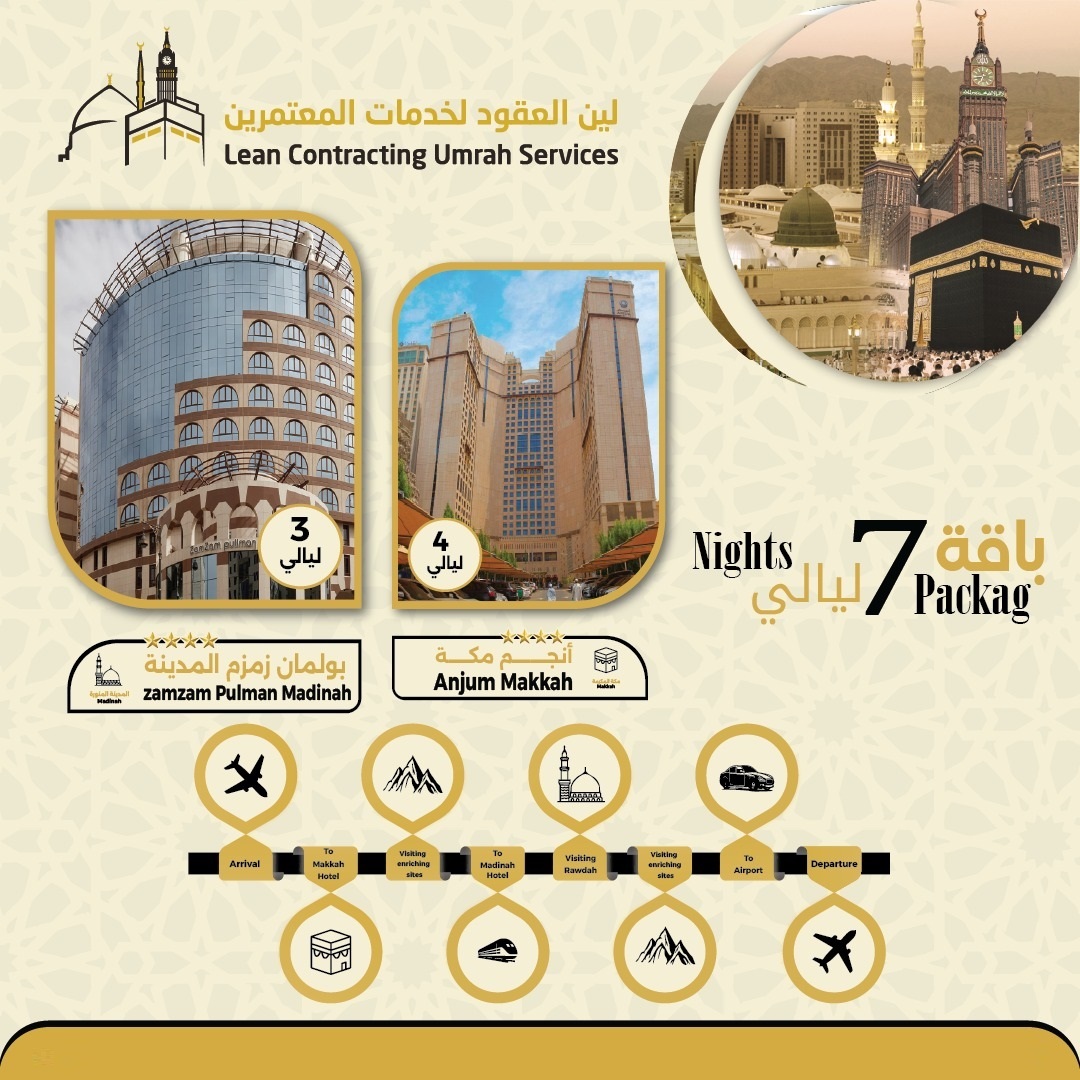 Premium Umrah package we aim through this package to facilitate the Umrah journey for all Muslims around the world while providing a unique spiritual and touristic experience that remains unforgettable we offer high quality services to meet your needs including reception and farewell services at the airport to ensure your comfort from arrival until departure transfer by luxury car from the airport to the hotel and from Makkah to Madinah by high speed train in economy class accommodation in hotels near the two holy mosques in Makkah and Madinah to provide the highest levels of comfort and luxury during your stay accommodation includes breakfast enriching visits to prominent historical and cultural sites in Makkah and Madinah we are keen in this package to provide a complete experience distinguished by high quality at every step from luxury transportation and comfortable accommodation to religious guidance and rich touristic experiences