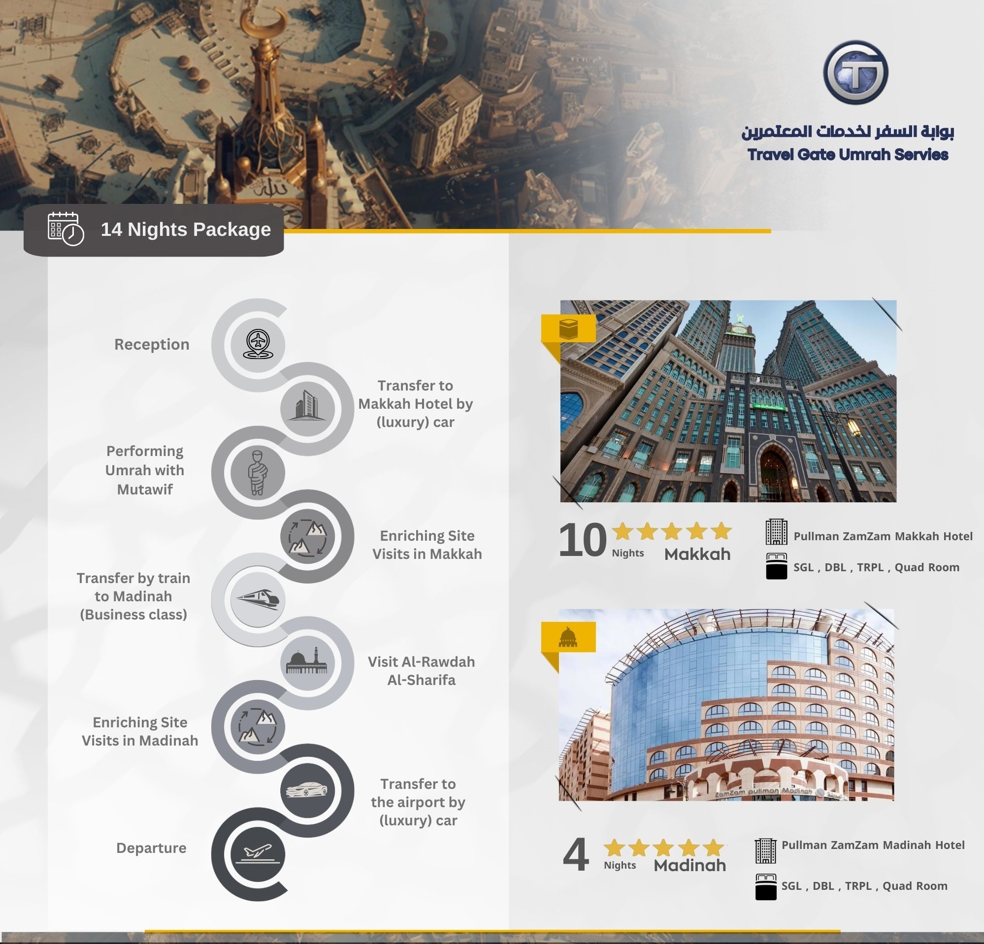 Luxury Umrah Package Our goal with this package is to facilitate the Umrah journey for Muslims from around the world, providing a unique spiritual and touristic experience that remains memorable for a lifetime. We offer high-quality services that meet all your needs, including: reception and farewell services at the airport, ensuring your comfort from arrival to departure. Luxury car transportation from the airport to the hotel, and from the hotel to the train station, ensuring smooth and premium transfers between Makkah and Madinah. Accommodation in five-star hotels in Makkah and Madinah, providing maximum comfort and luxury throughout your stay. Accommodation includes Breakfast. Visit to the Prophet's Mosque's Rawdah (Al-Rawdah Al-Sharifa) in Madinah. Business-class train transportation from Makkah to Madinah for a high-end and comfortable travel experience. Performing Umrah with a licensed guide (Mutawwif), who will provide complete religious guidance to ensure the smooth performance of all rituals. Enriching visits to significant historical and cultural sites in both Makkah and Madinah with a licensed tour guide. With this package, we ensure a comprehensive experience characterized by high-quality service at every step, from luxury transportation and comfortable accommodation to religious guidance and enriching touristic experiences.