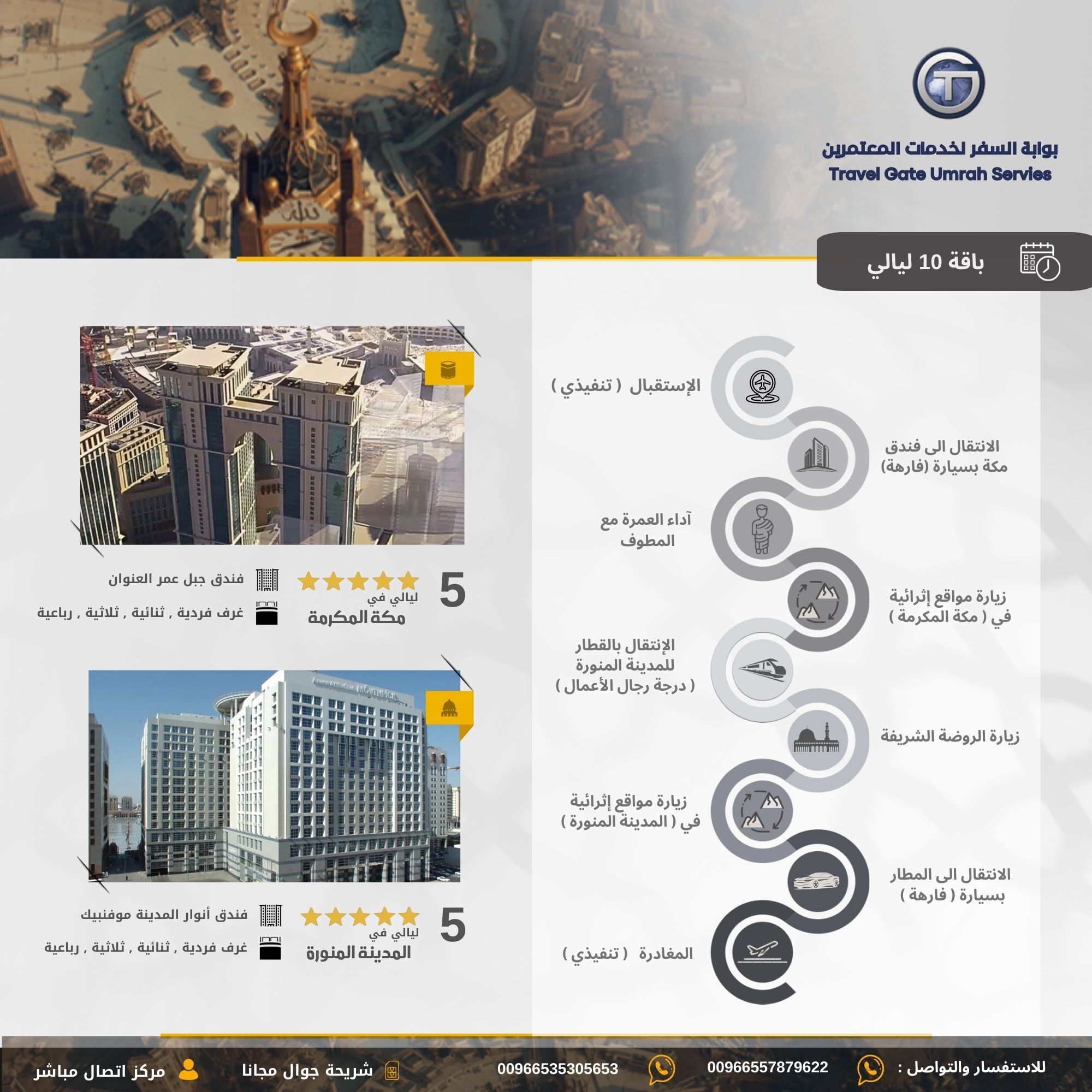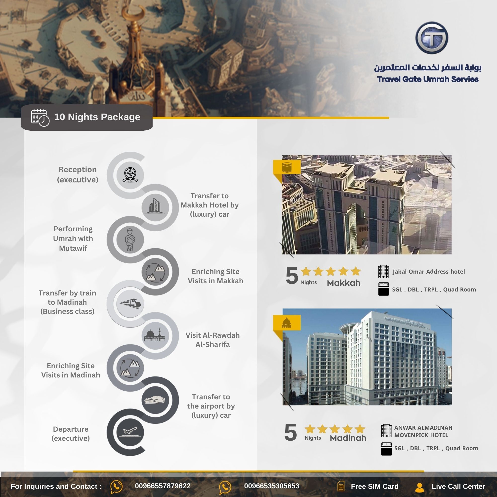 Premium Umrah Package Our goal with this package is to facilitate the Umrah journey for Muslims from around the world, providing a unique spiritual and touristic experience that remains memorable for a lifetime. We offer high-quality services that meet all your needs, including: Executive reception and farewell services at the airport, ensuring your comfort from arrival to departure. Luxury car transportation from the airport to the hotel, and from the hotel to the train station, ensuring smooth and premium transfers between Makkah and Madinah. Accommodation in five-star hotels in Makkah and Madinah, providing maximum comfort and luxury throughout your stay. Accommodation includes Breakfast. (Half Board). Visit to the Prophet's Mosque's Rawdah (Al-Rawdah Al-Sharifa) in Madinah. Business-class train transportation from Makkah to Madinah for a high-end and comfortable travel experience. Performing Umrah with a licensed guide (Mutawwif), who will provide complete religious guidance to ensure the smooth performance of all rituals. Enriching visits to significant historical and cultural sites in both Makkah and Madinah with a licensed tour guide. With this package, we ensure a comprehensive experience characterized by high-quality service at every step, from luxury transportation and comfortable accommodation to religious guidance and enriching touristic experiences.