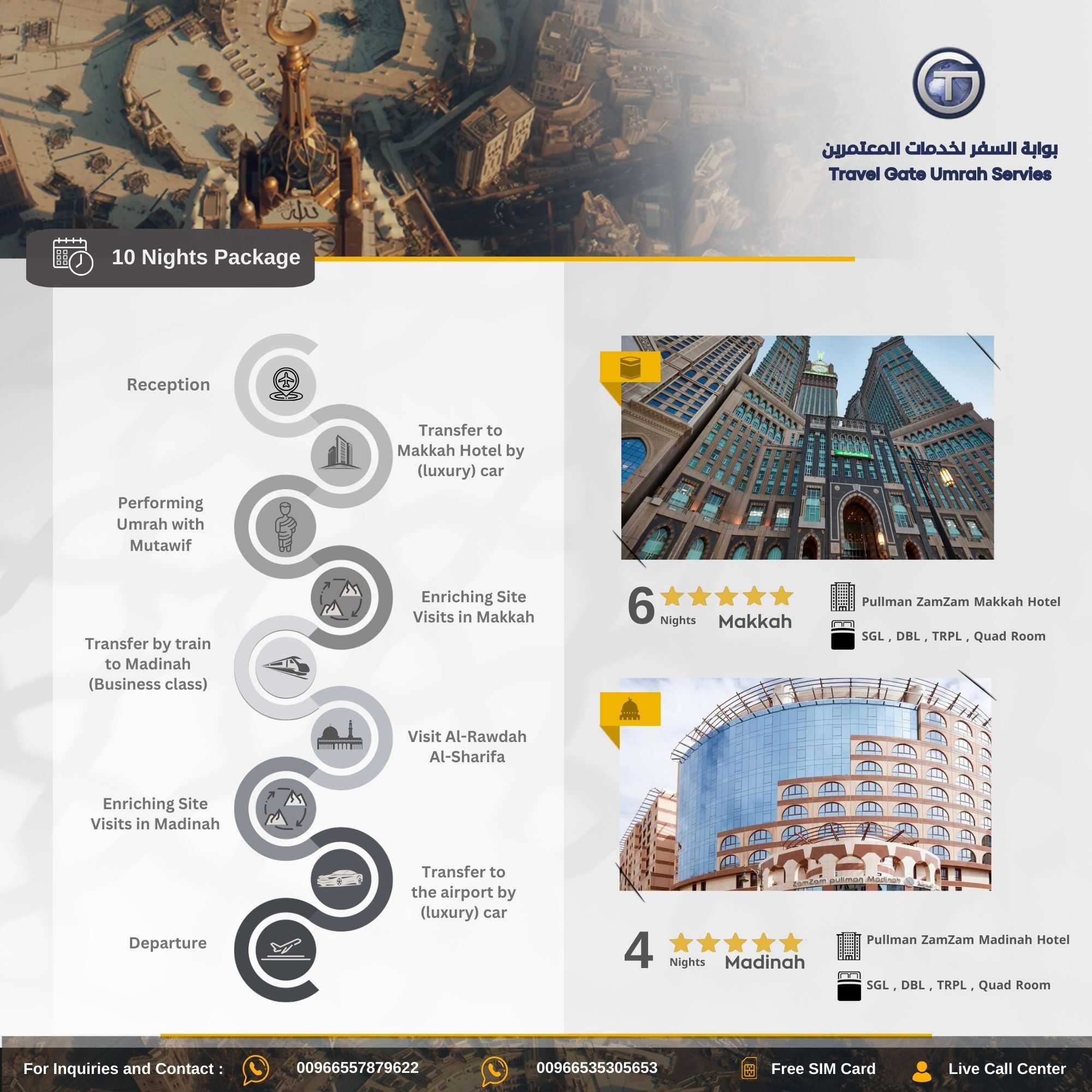 Premium Umrah Package Our goal with this package is to facilitate the Umrah journey for Muslims from around the world, providing a unique spiritual and touristic experience that remains memorable for a lifetime. We offer high-quality services that meet all your needs, including: reception and farewell services at the airport, ensuring your comfort from arrival to departure. Luxury car transportation from the airport to the hotel, and from the hotel to the train station, ensuring smooth and premium transfers between Makkah and Madinah. Accommodation in five-star hotels in Makkah and Madinah, providing maximum comfort and luxury throughout your stay. Accommodation includes Breakfast. Visit to the Prophet's Mosque's Rawdah (Al-Rawdah Al-Sharifa) in Madinah. Business-class train transportation from Makkah to Madinah for a high-end and comfortable travel experience. Performing Umrah with a licensed guide (Mutawwif), who will provide complete religious guidance to ensure the smooth performance of all rituals. Enriching visits to significant historical and cultural sites in both Makkah and Madinah with a licensed tour guide. With this package, we ensure a comprehensive experience characterized by high-quality service at every step, from luxury transportation and comfortable accommodation to religious guidance and enriching touristic experiences.