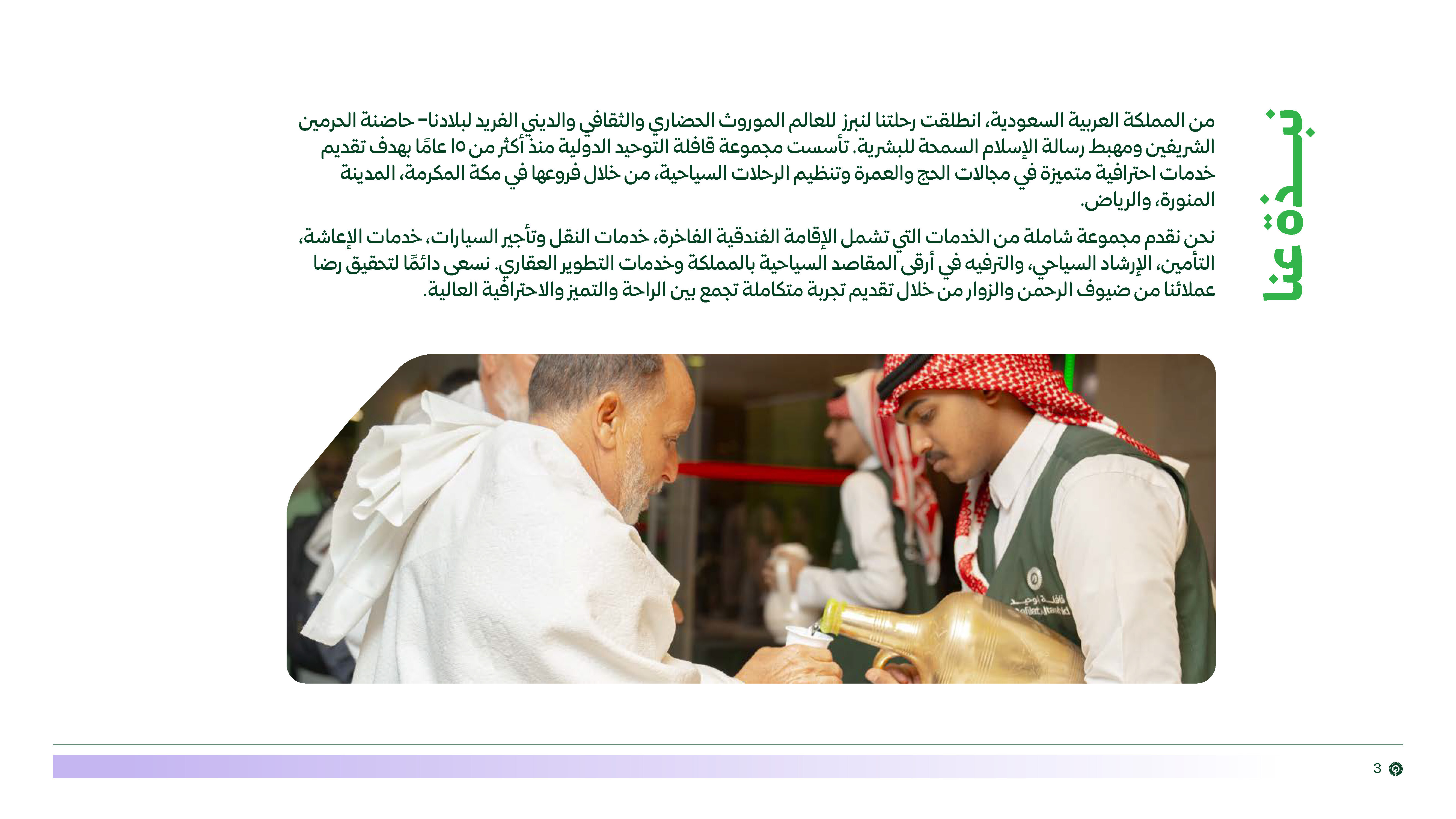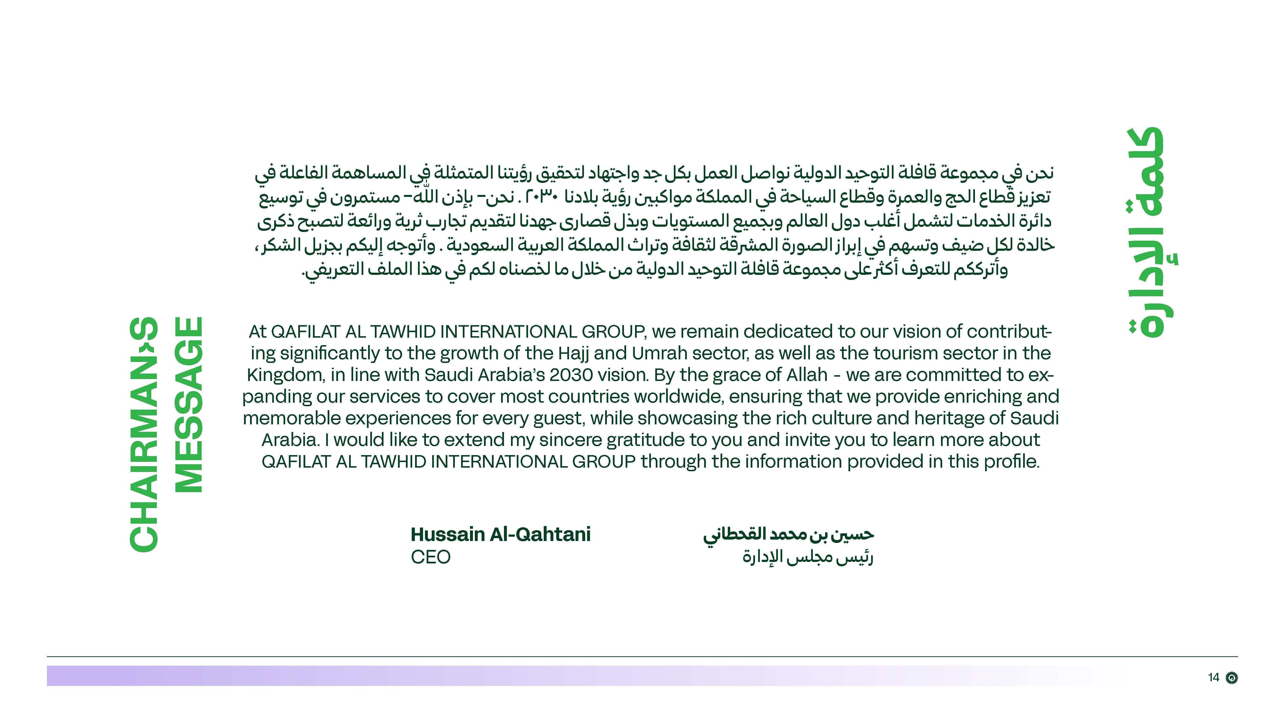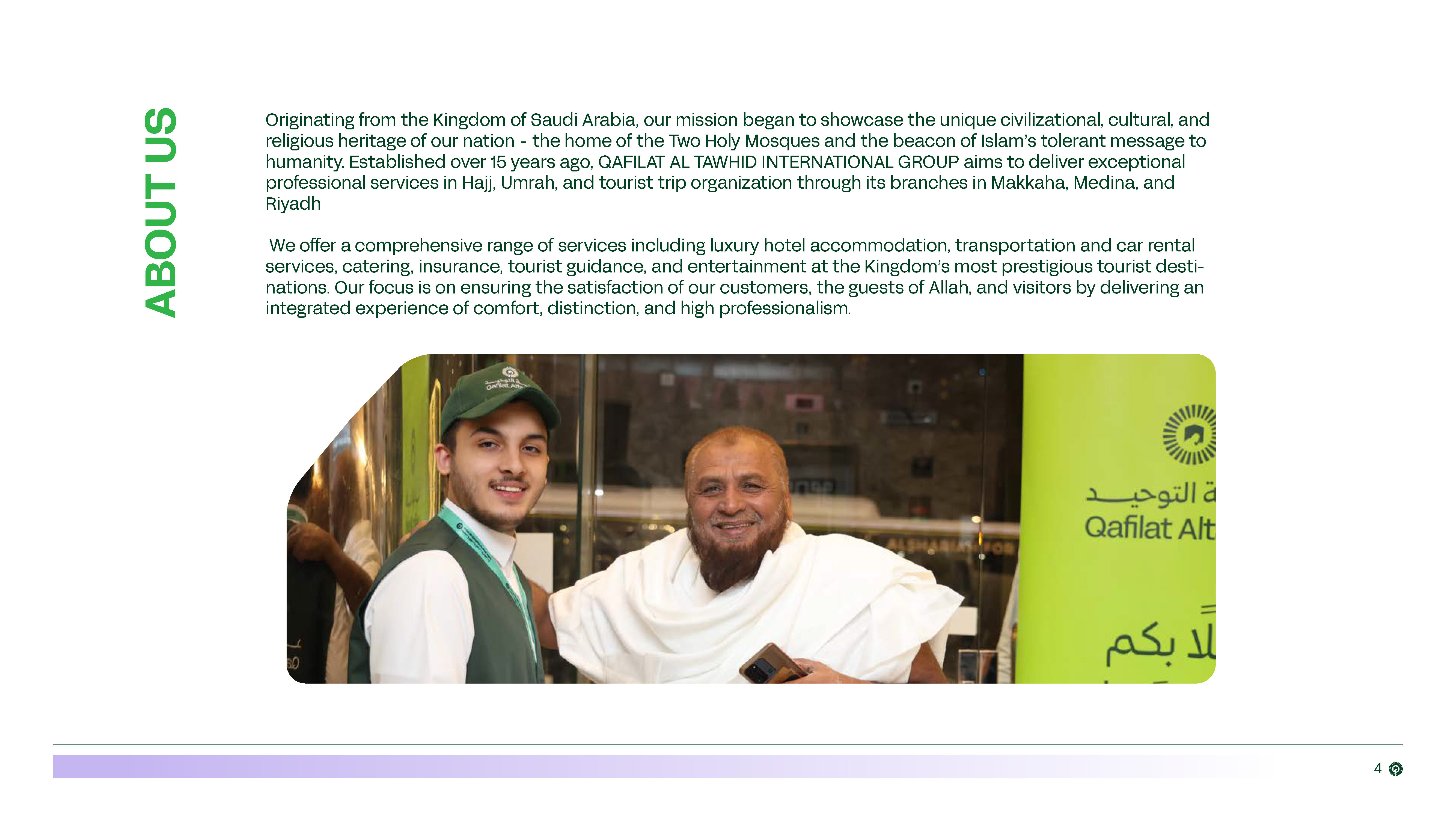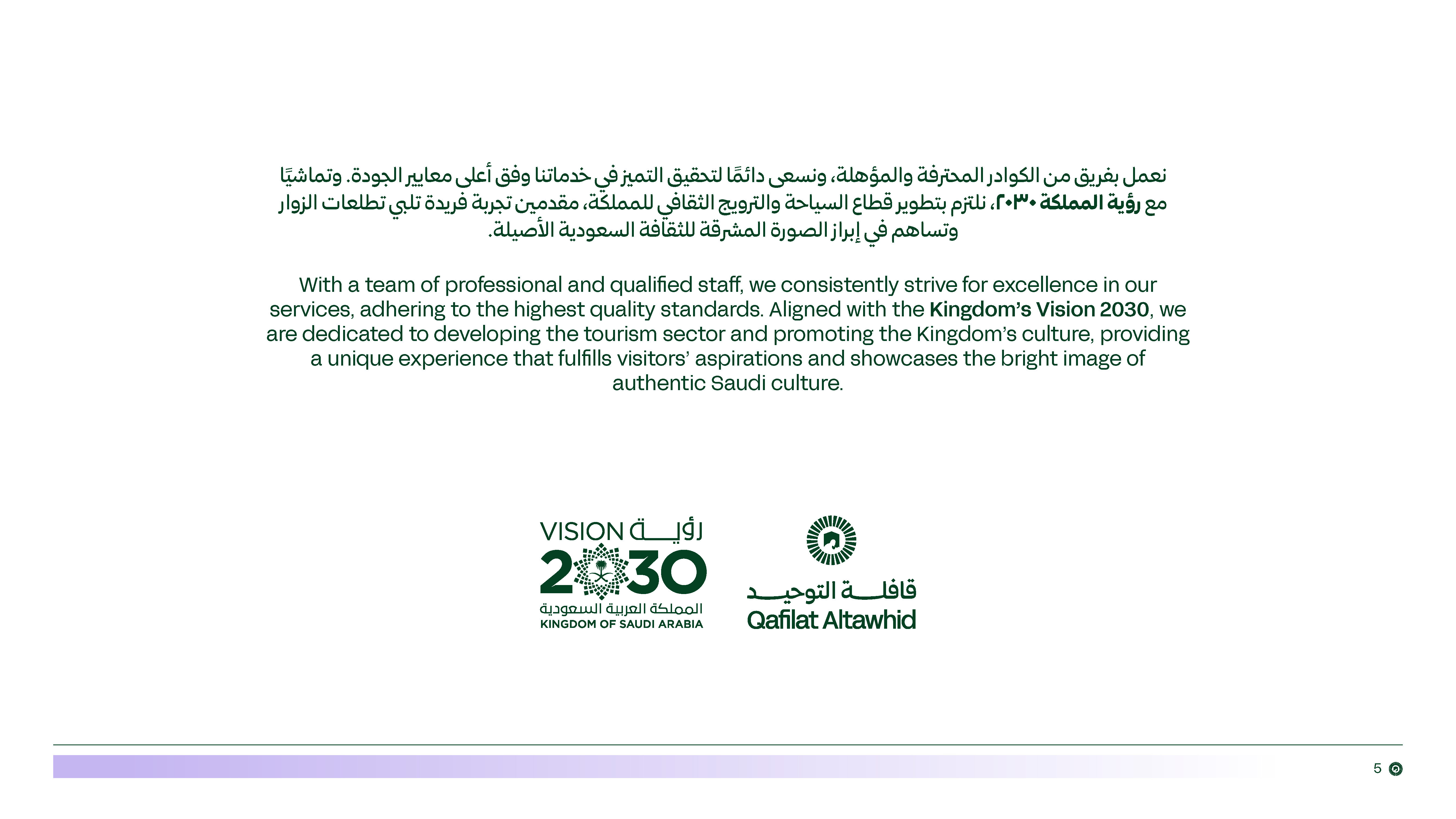 From the Kingdom of Saudi Arabia, our journey has begun to highlight to the world the unique cultural, religious and civilizational heritage of our country, the cradle of the Two Holy Mosques and the cradle of the tolerant message of Islam to humanity. Qafilat Altawhid International Group is one of the most prominent providers of Umrah and tourism services and one of the leading companies in the Kingdom of Saudi Arabia with more than 15 years of experience in this field. Our company has built a strong reputation for providing exceptional services, ensuring that every visitor's journey is smooth and spiritual, in the fields of Hajj and Umrah services and organizing tourist trips, through its branches in Makkah, Madina, and Riyadh. And virtual branch points in many cities and tourist sites. We offer a comprehensive range of services including luxury hotel accommodation, Umrah visa issuance services, transportation and car rental services, catering services, insurance, tour guides, We always strive to achieve the satisfaction of our customers, guests of the Most Gracious and visitors, by providing an integrated experience that combines comfort, distinction and high professionalism. We are pleased to offer a range of comprehensive tourism packages designed specifically to enable you to explore Makkah, Madina and the rest of the cities of the Kingdom of Saudi Arabia in the best possible way. These packages allow you to perform rituals with spirituality and faith and the opportunity to enjoy the ancient history, local culture, natural landmarks, and fun recreational activities. We also offer additional options to customize tours to suit your specific interests with professional guides and a staff at your service 24 hours a day.