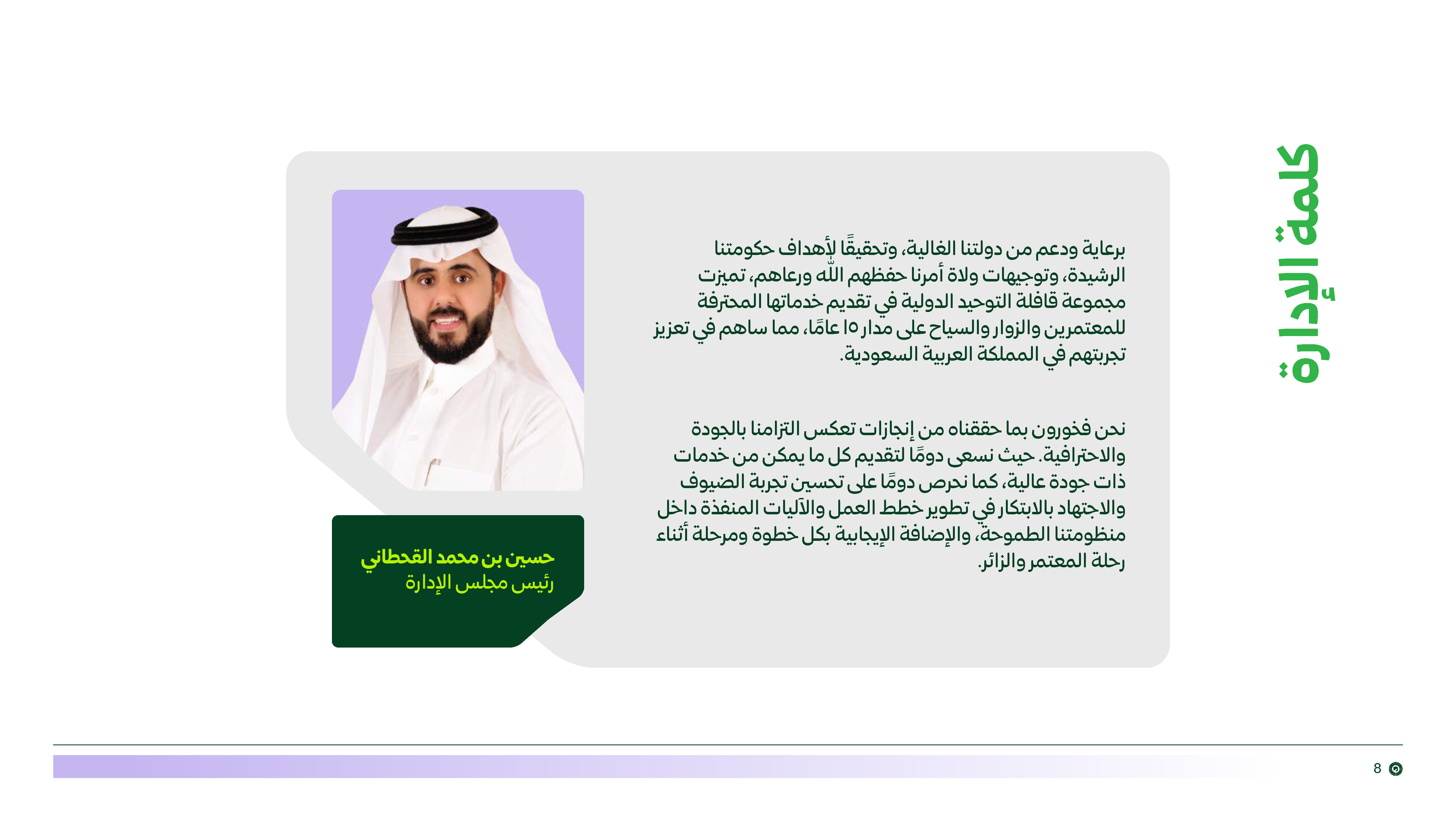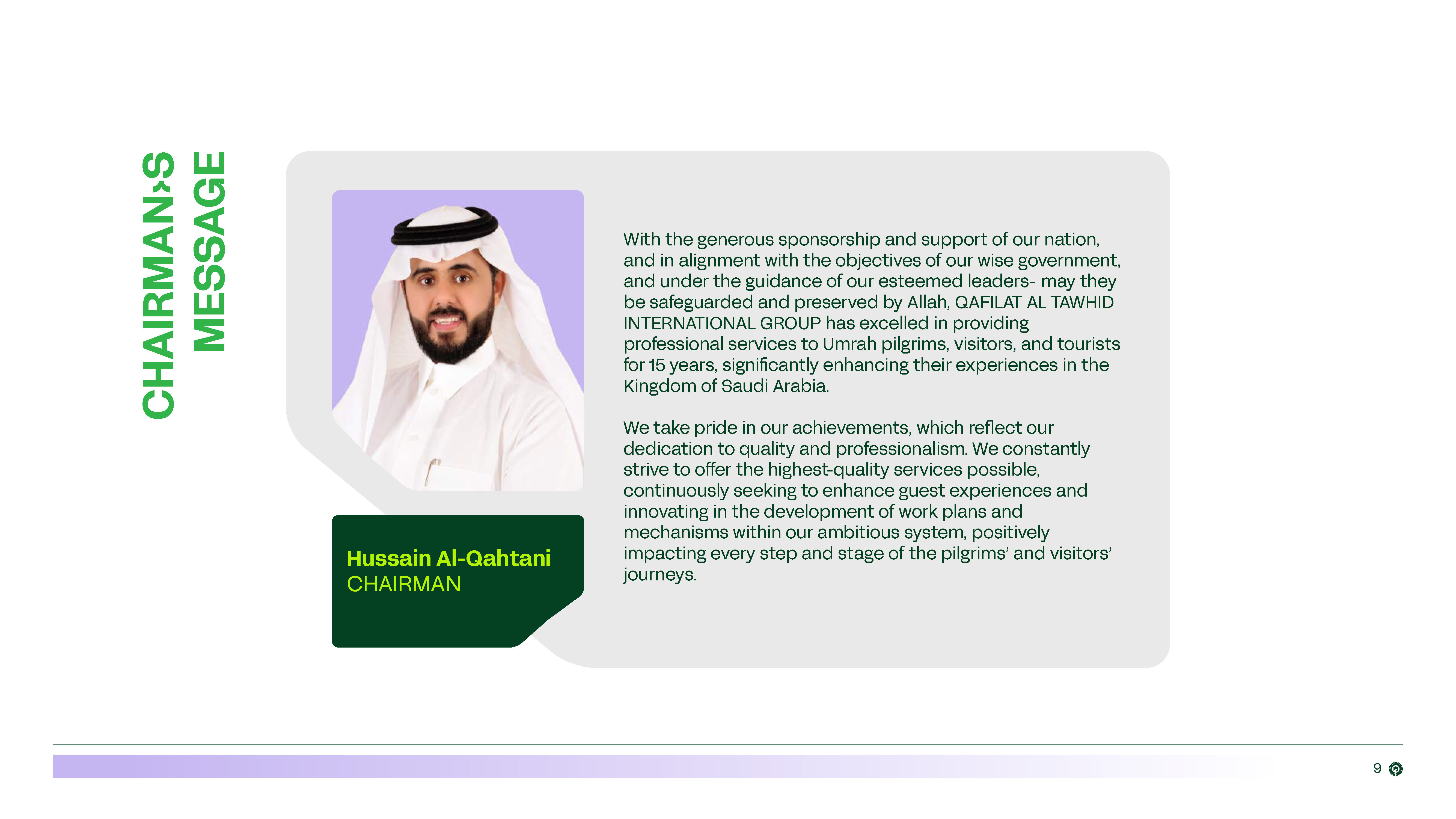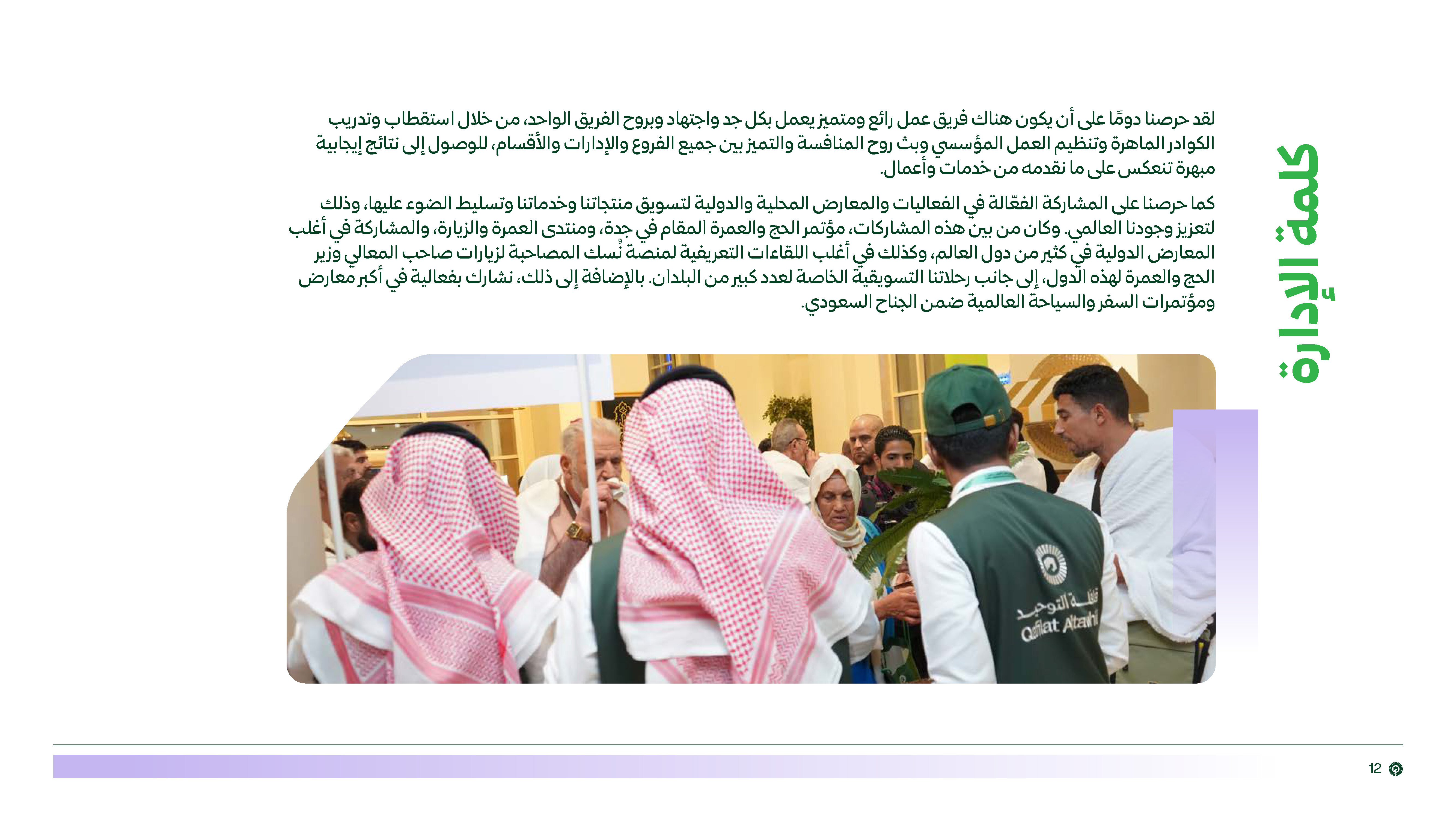 From the Kingdom of Saudi Arabia, our journey has begun to highlight to the world the unique cultural, religious and civilizational heritage of our country, the cradle of the Two Holy Mosques and the cradle of the tolerant message of Islam to humanity. Qafilat Altawhid International Group is one of the most prominent providers of Umrah and tourism services and one of the leading companies in the Kingdom of Saudi Arabia with more than 15 years of experience in this field. Our company has built a strong reputation for providing exceptional services, ensuring that every visitor's journey is smooth and spiritual, in the fields of Hajj and Umrah services and organizing tourist trips, through its branches in Makkah, Madina, and Riyadh. And virtual branch points in many cities and tourist sites. We offer a comprehensive range of services including luxury hotel accommodation, Umrah visa issuance services, transportation and car rental services, catering services, insurance, tour guides, We always strive to achieve the satisfaction of our customers, guests of the Most Gracious and visitors, by providing an integrated experience that combines comfort, distinction and high professionalism. We are pleased to offer a range of comprehensive tourism packages designed specifically to enable you to explore Makkah, Madina and the rest of the cities of the Kingdom of Saudi Arabia in the best possible way. These packages allow you to perform rituals with spirituality and faith and the opportunity to enjoy the ancient history, local culture, natural landmarks, and fun recreational activities. We also offer additional options to customize tours to suit your specific interests with professional guides and a staff at your service 24 hours a day.