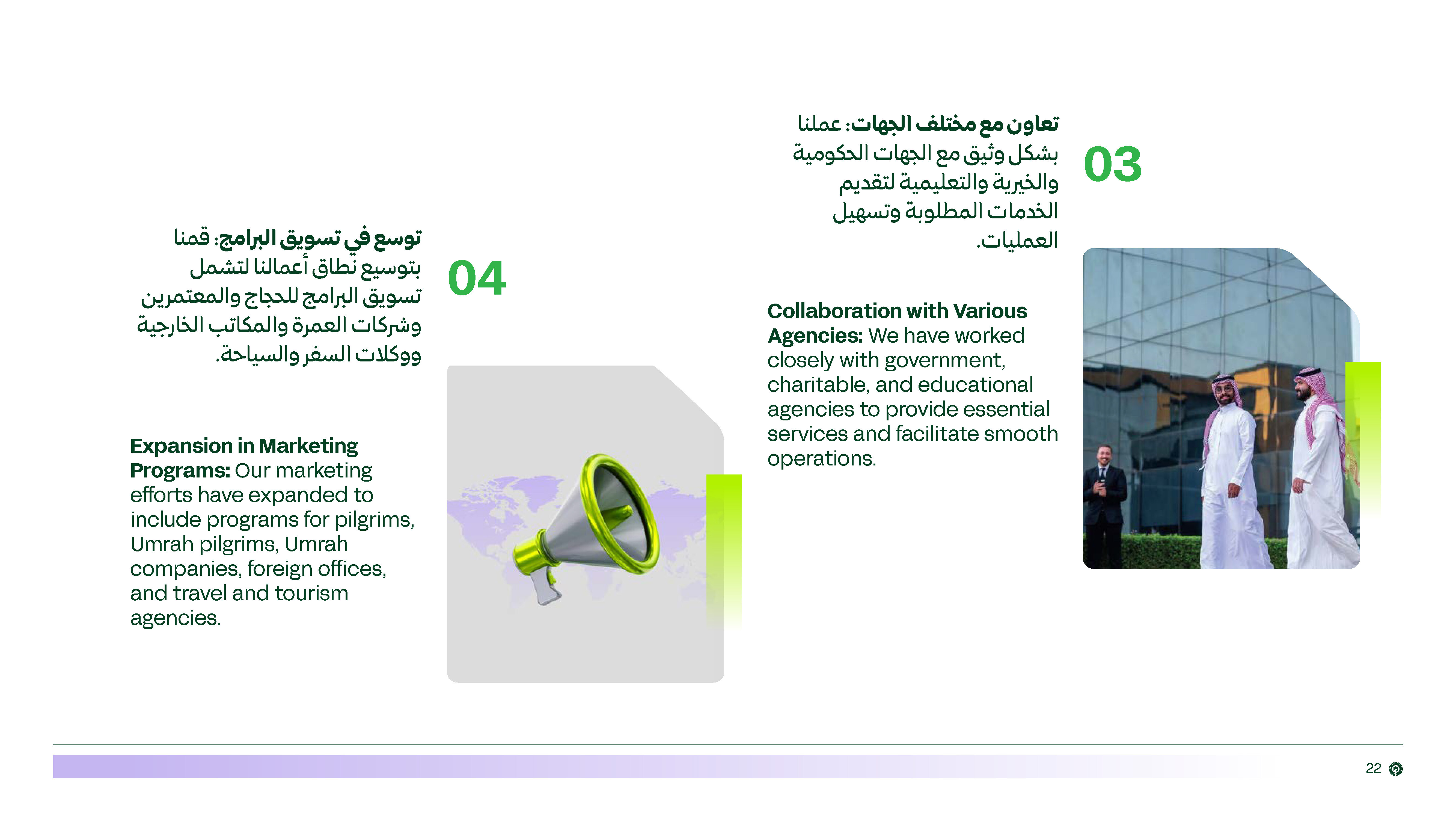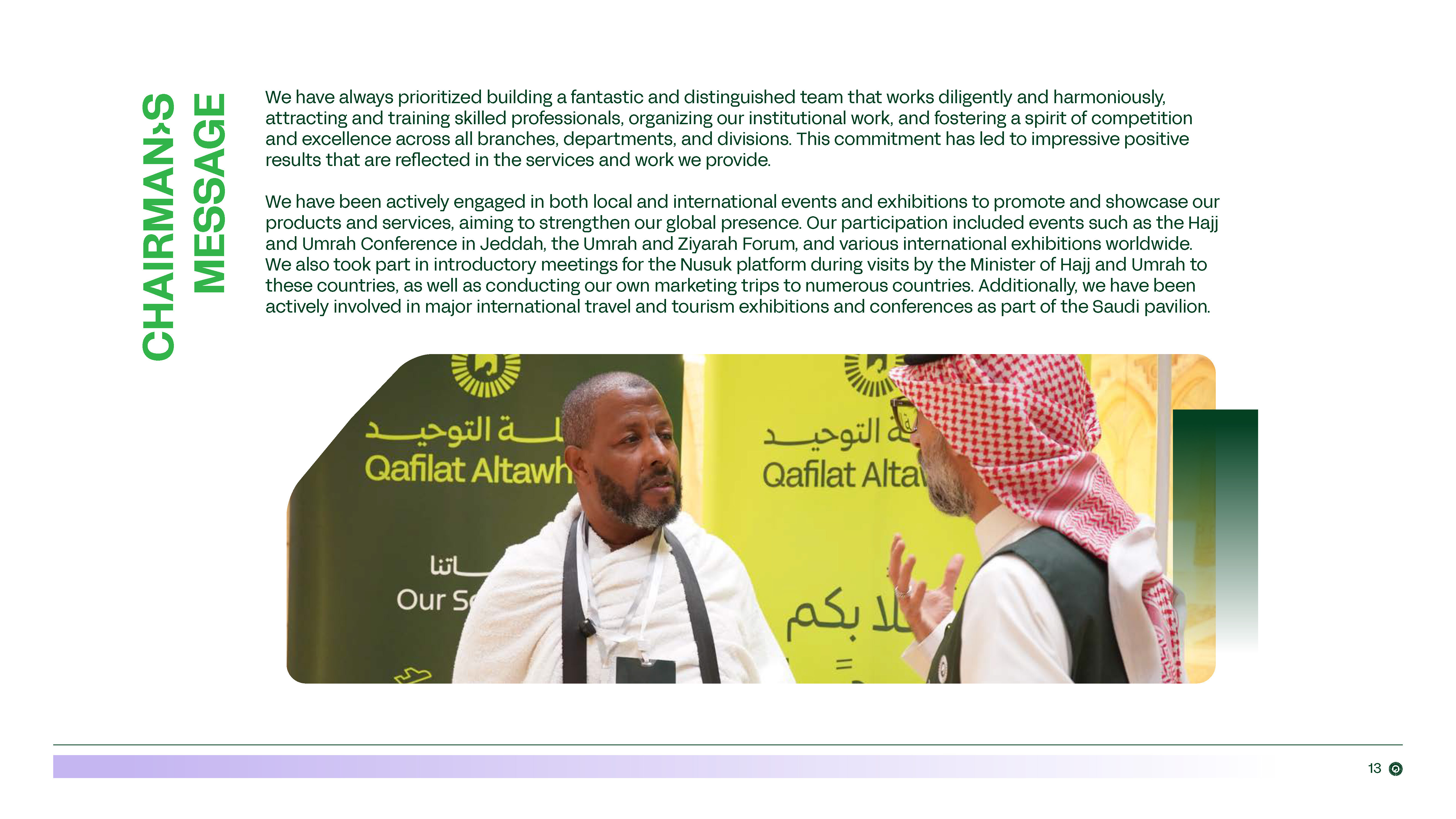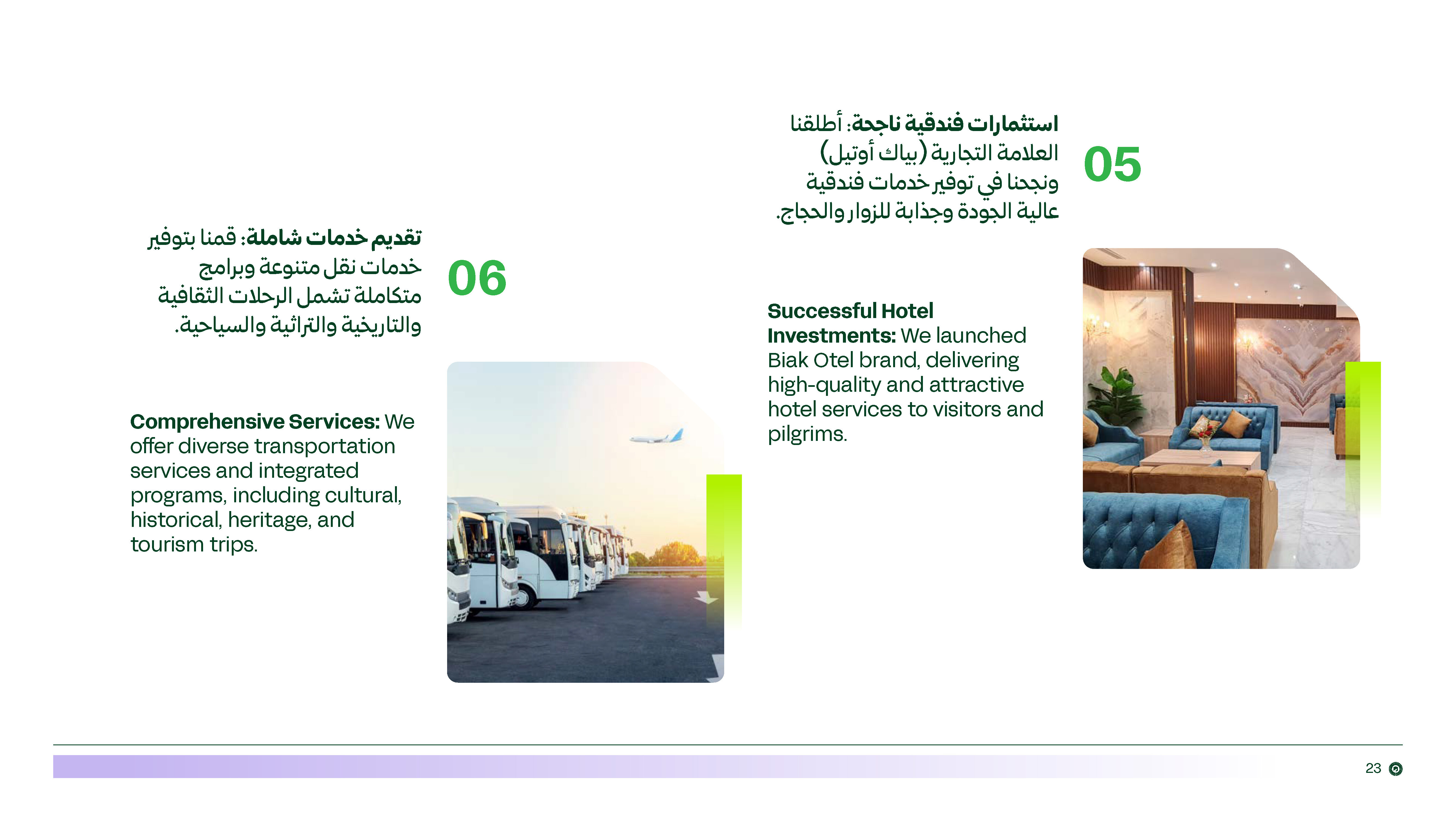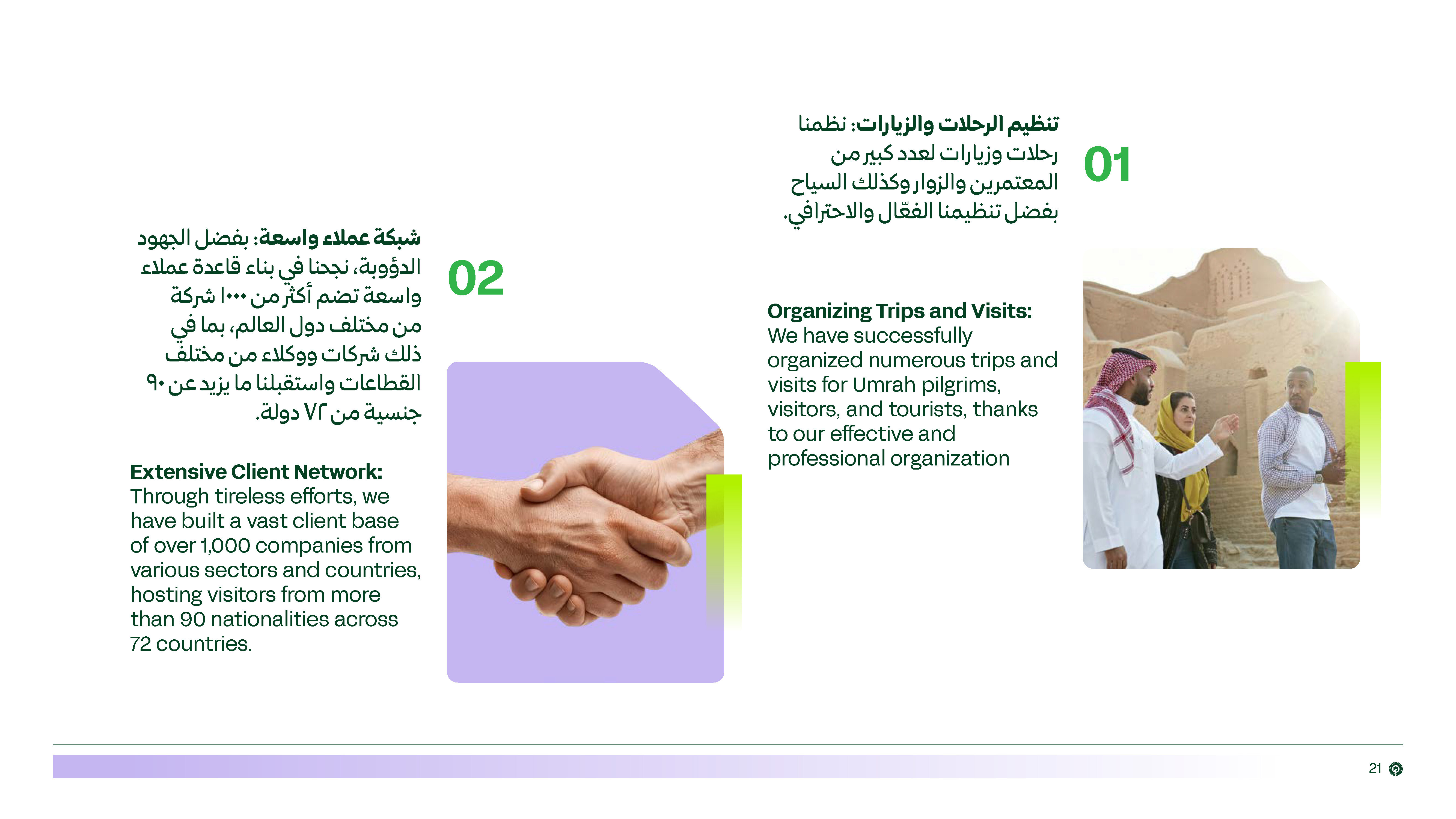 From the Kingdom of Saudi Arabia, our journey has begun to highlight to the world the unique cultural, religious and civilizational heritage of our country, the cradle of the Two Holy Mosques and the cradle of the tolerant message of Islam to humanity. Qafilat Altawhid International Group is one of the most prominent providers of Umrah and tourism services and one of the leading companies in the Kingdom of Saudi Arabia with more than 15 years of experience in this field. Our company has built a strong reputation for providing exceptional services, ensuring that every visitor's journey is smooth and spiritual, in the fields of Hajj and Umrah services and organizing tourist trips, through its branches in Makkah, Madina, and Riyadh. And virtual branch points in many cities and tourist sites. We offer a comprehensive range of services including luxury hotel accommodation, Umrah visa issuance services, transportation and car rental services, catering services, insurance, tour guides, We always strive to achieve the satisfaction of our customers, guests of the Most Gracious and visitors, by providing an integrated experience that combines comfort, distinction and high professionalism. We are pleased to offer a range of comprehensive tourism packages designed specifically to enable you to explore Makkah, Madina and the rest of the cities of the Kingdom of Saudi Arabia in the best possible way. These packages allow you to perform rituals with spirituality and faith and the opportunity to enjoy the ancient history, local culture, natural landmarks, and fun recreational activities. We also offer additional options to customize tours to suit your specific interests with professional guides and a staff at your service 24 hours a day.
